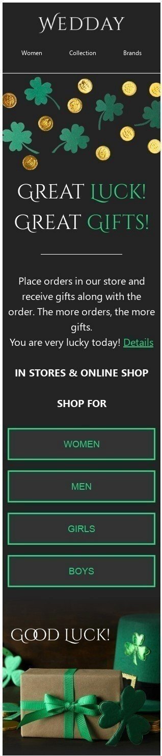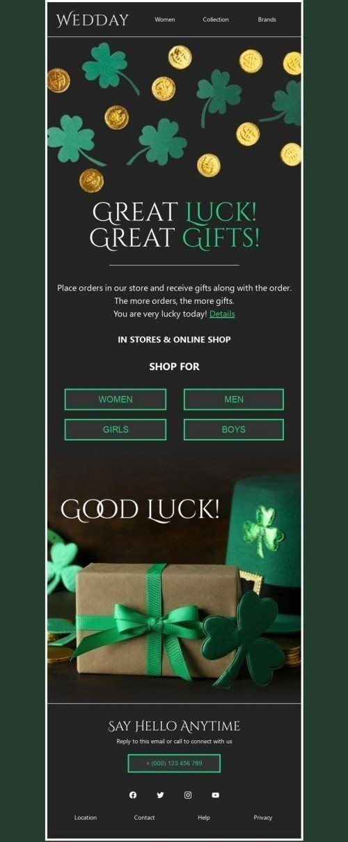 Célébrez St. Patrick’s Day avec notre modèle d'email "Great Luck" conçu pour l'industrie de la mode. Ce modèle personnalisable présente un design festif qui met en valeur votre dernière collection de mode pour St. Patrick's Day et invite les abonnés à acheter des porte-bonheurs et des accessoires verts. Utilisez ce modèle pour offrir des promotions spéciales ou des réductions sur les tenues de St. Patrick's Day. Avec un fort bouton d’appel à l’action et un design visuellement attrayant, ce modèle d'email peut stimuler l’engagement et augmenter vos ventes. Ne manquez pas l'occasion d'embrasser l'esprit de St. Patrick's Day et de partager la chance des Irlandais avec votre public grâce à notre modèle d'email captivant.
