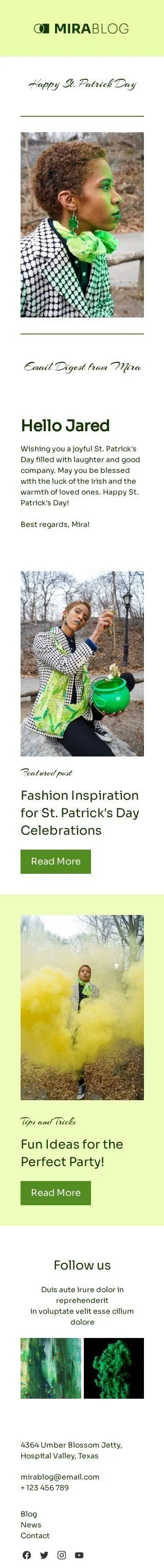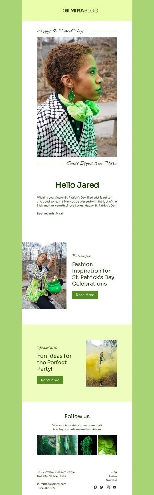 Bring the luck of the Irish to your subscribers this St. Patrick's Day with our "The Luck of the Irish" email template. Specifically designed for publications and blogging industries, this fully customizable template features a fun and festive green and gold color scheme, complete with shamrocks and leprechaun hats. Use it to promote your St. Patrick's Day content or simply to wish your subscribers a bit of Irish luck. With a strong call-to-action button and a sleek design, this email template is sure to engage your subscribers and keep them coming back for more!