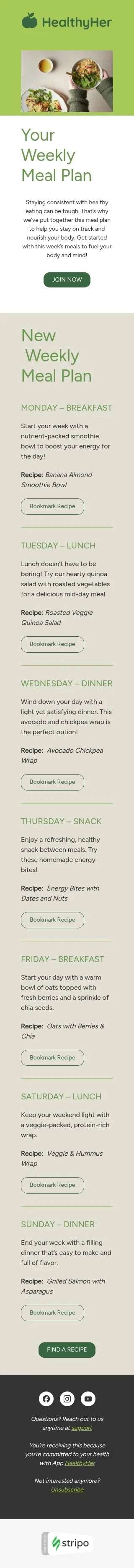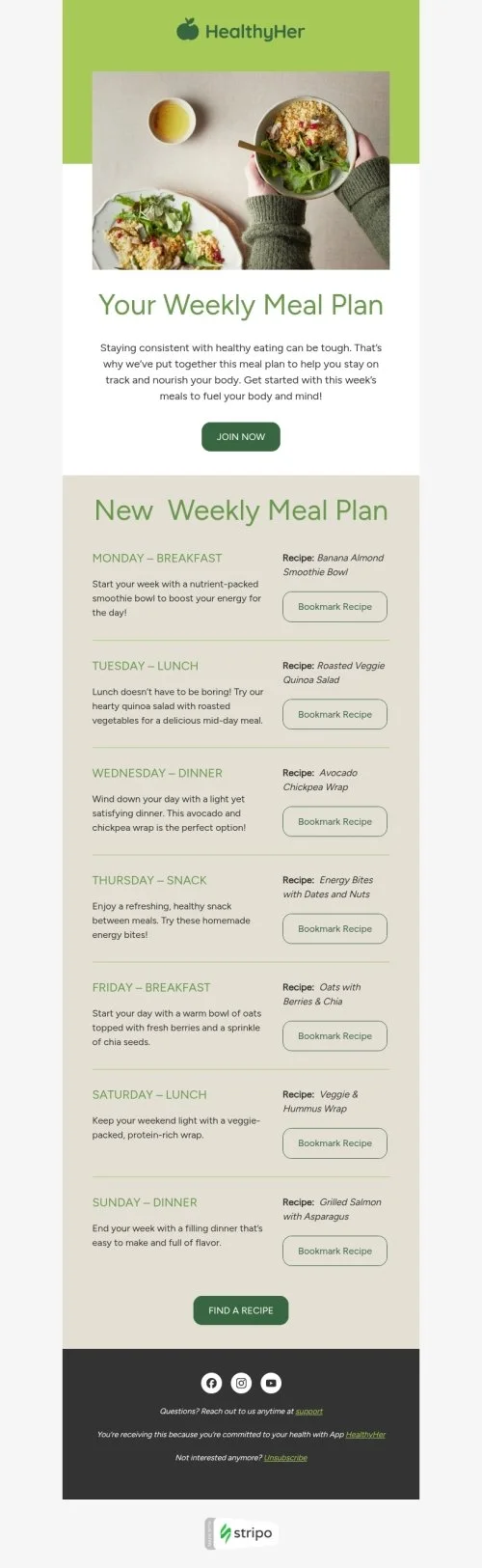Modèle de courrier électronique entretien des stries «Plan de repas hebdomadaire» pour le secteur nourriture