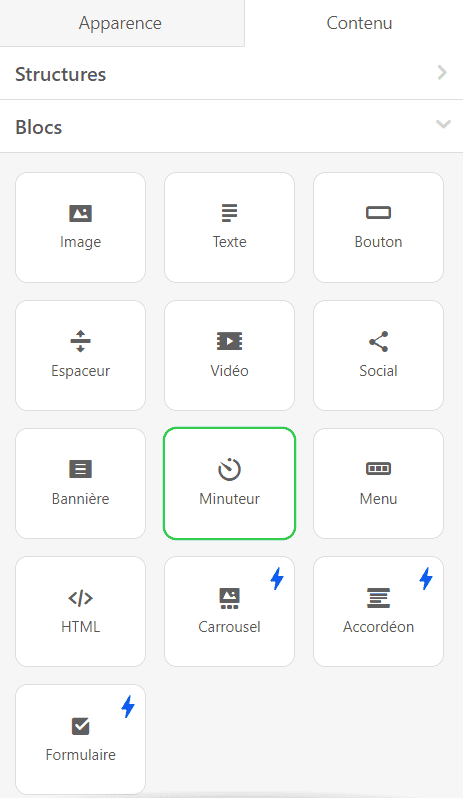 Vous pouvez aussi le faire dans notre éditeur :). Allez dans la section "Contenu", puis cliquez sur "Blocs", trouvez le bloc "Minuteur", et faites-le glisser sur le conteneur nécessaire de votre modèle d'e-mail.
