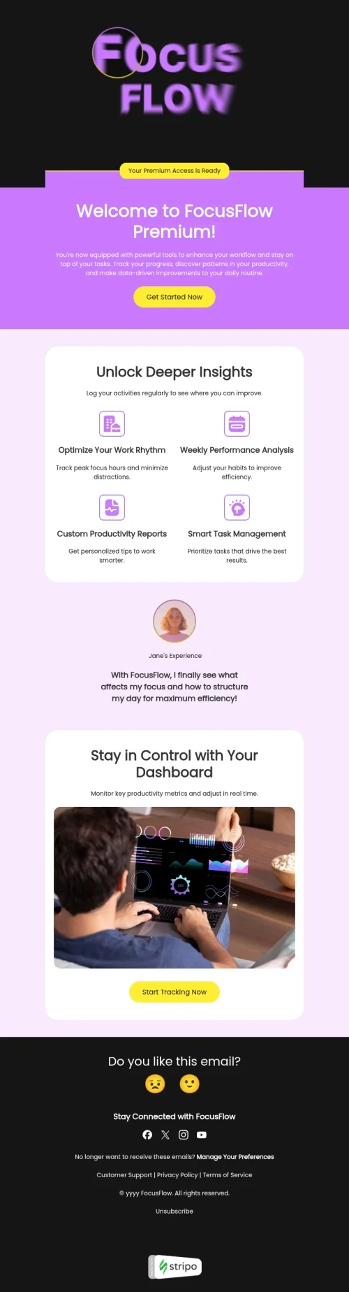 Modèle de courrier électronique bienvenue «Prenez le contrôle de votre productivité» pour le secteur applications mobiles