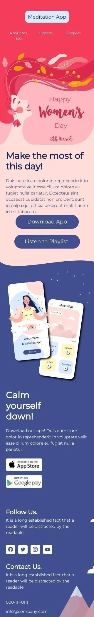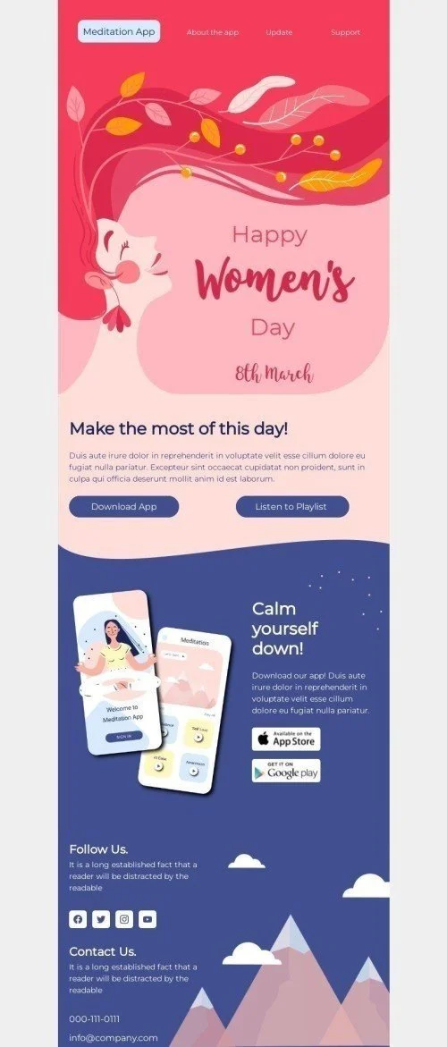 Célébrez Women's Day avec notre "Make the Most of This Day" Email Template, conçu exclusivement pour l'industrie du sport. Cet e-mail présente notre dernier équipement de fitness ou matériel de sport qui est parfait pour les femmes qui souhaitent mener une vie active et saine. Le modèle est entièrement personnalisable et comprend des images inspirantes de femmes s'entraînant, ainsi qu'un message encourageant les clients à donner la priorité à leur santé et à leur forme physique en ce jour spécial. Idéal pour promouvoir vos offres spéciales de Women's Day, cet e-mail augmentera l' engagement des clients et stimulera les ventes.