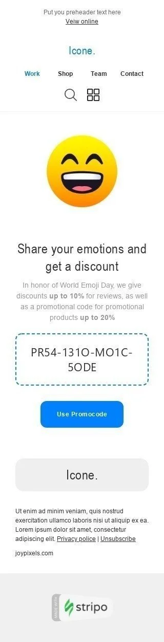 Célébrez la Journée Mondiale de l'Émoji avec notre nouveau modèle d'email "Partagez vos Émotions" pour l'industrie du Mobilier, de l'Intérieur et du DIY. Ce modèle est conçu pour promouvoir vos produits et encourager les clients à partager leurs émotions et leur personnalité à travers leur décoration intérieure. Le modèle présente un design ludique et tendance qui complétera n'importe quelle marque de Mobilier, d'Intérieur et de DIY. Il est entièrement personnalisable, vous pouvez donc facilement ajouter votre propre image de marque et vos messages. Encouragez les clients à s'exprimer avec notre modèle d'email "Partagez vos Émotions" de la Journée Mondiale de l'Émoji.