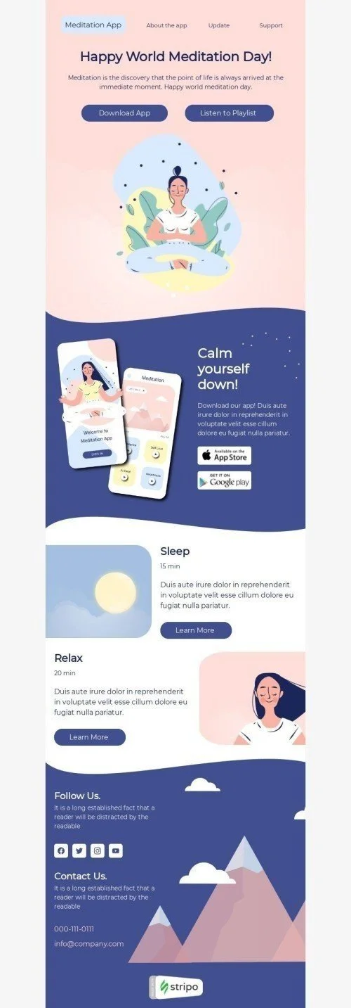 Take a moment to relax with our "Calm Yourself Down!" Email Template, designed exclusively for World Meditation Day and the Software & Technology industry. This email features our latest meditation software, which includes guided meditations, calming music, and soothing nature sounds. The template is fully customizable and includes images of serene landscapes, as well as a message encouraging customers to take time for themselves and find inner peace. Ideal for promoting your World Meditation Day specials, this email will increase customer engagement and drive sales.