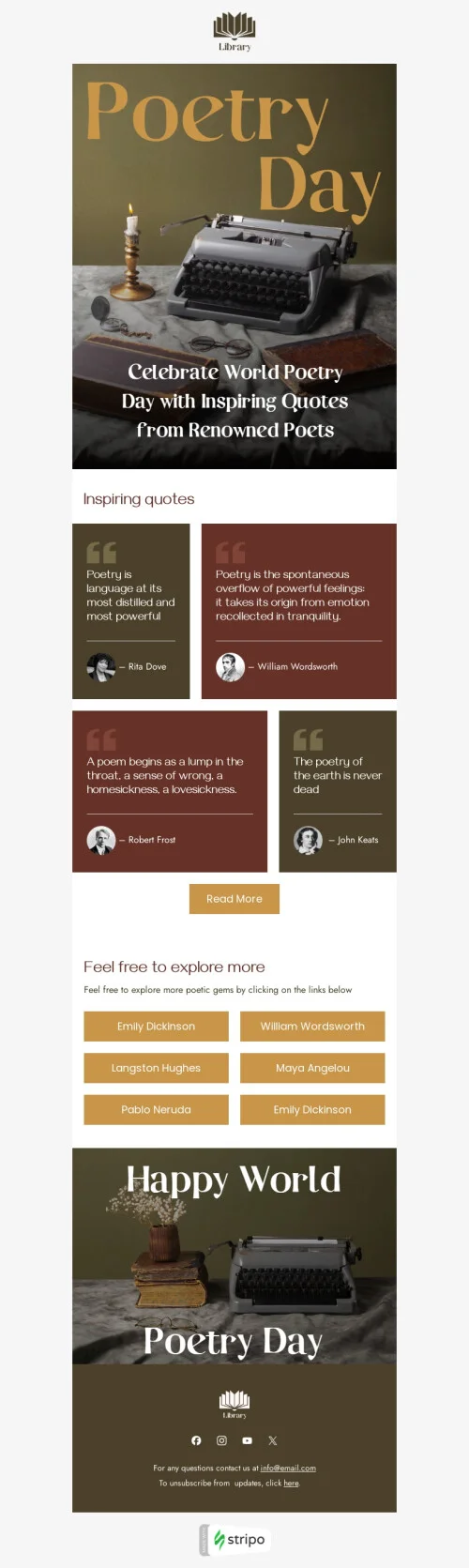Célébrez la Journée mondiale de la poésie avec notre modèle d'email "Poètes renommés", conçu pour l'industrie des livres, des cadeaux et de la papeterie. Ce modèle rend hommage à l'art de la poésie, présentant des citations inspirantes, des vers emblématiques et des lectures recommandées de poètes célèbres. Partagez des collections exclusives, des événements littéraires ou des ateliers d'écriture créative sans effort. Que ce soit pour les passionnés de poésie ou les écrivains en herbe, ce modèle simplifie la communication et établit la norme pour des emails captivants lors de la Journée mondiale de la poésie. Faites confiance à son efficacité pour engager votre public et éveiller leur passion pour l'expression poétique et l'exploration littéraire.