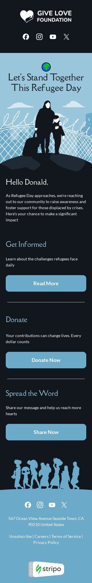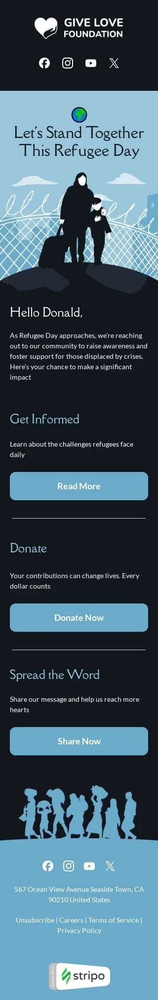 Restez unis lors de la Journée mondiale des réfugiés avec notre modèle d'email "Unissons-nous", conçu pour l'industrie de la collecte de fonds. Ce modèle amplifie les voix de la résilience, partageant des histoires de réfugiés convaincantes, des appels urgents et des moyens concrets de soutenir. Mettez en avant les opportunités de dons, les initiatives de bénévolat et les projets impactants sans effort. Que ce soit pour les donateurs, les défenseurs ou les soutiens, ce modèle simplifie la communication et établit la norme pour des emails sincères lors de la Journée mondiale des réfugiés. Faites confiance à son efficacité pour inspirer la solidarité, sensibiliser et mobiliser une communauté compatissante dédiée à fournir aide et refuge aux personnes déplacées dans le monde entier.