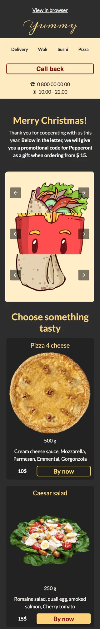 Festeggia la stagione delle festività con stile e deliziosità con il Template Email di Natale "Pizza di Natale". Perfetto per le aziende nel settore alimentare, questo template presenta un'immagine di intestazione che fa venire l'acquolina in bocca di una pizza addobbata per le festività. Il layout facile da personalizzare ti consente di aggiungere il tuo tocco unico al design, rendendolo un'ottima scelta per il tuo marchio. Usa questo template per promuovere il tuo menu di Natale, offrire offerte speciali e sconti, o semplicemente per augurare ai tuoi clienti una felice stagione festiva. Preparati a diffondere la gioia delle festività e aumentare le tue vendite con il Template Email di Natale "Pizza di Natale".