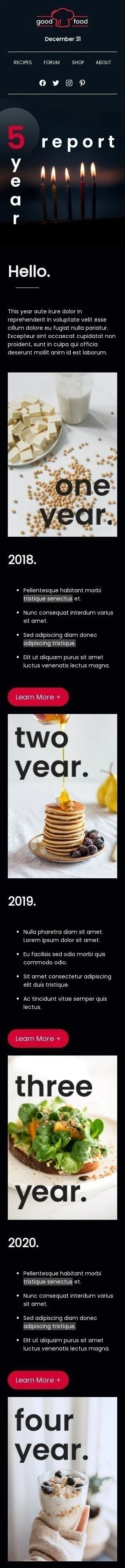 Con il nostro modello di email "rapporto quinquennale", puoi informare i tuoi clienti in modo semplice e veloce sui progressi della tua azienda negli ultimi cinque anni. Questo modello è stato progettato specificamente per le aziende del settore alimentare e fornisce una panoramica della tua attività, delle prestazioni finanziarie, dei prodotti e dei servizi. Include anche una sezione per le testimonianze dei clienti, un ottimo modo per mostrare ai potenziali clienti cosa pensano gli altri della tua azienda. Non aspettare, usalo subito!