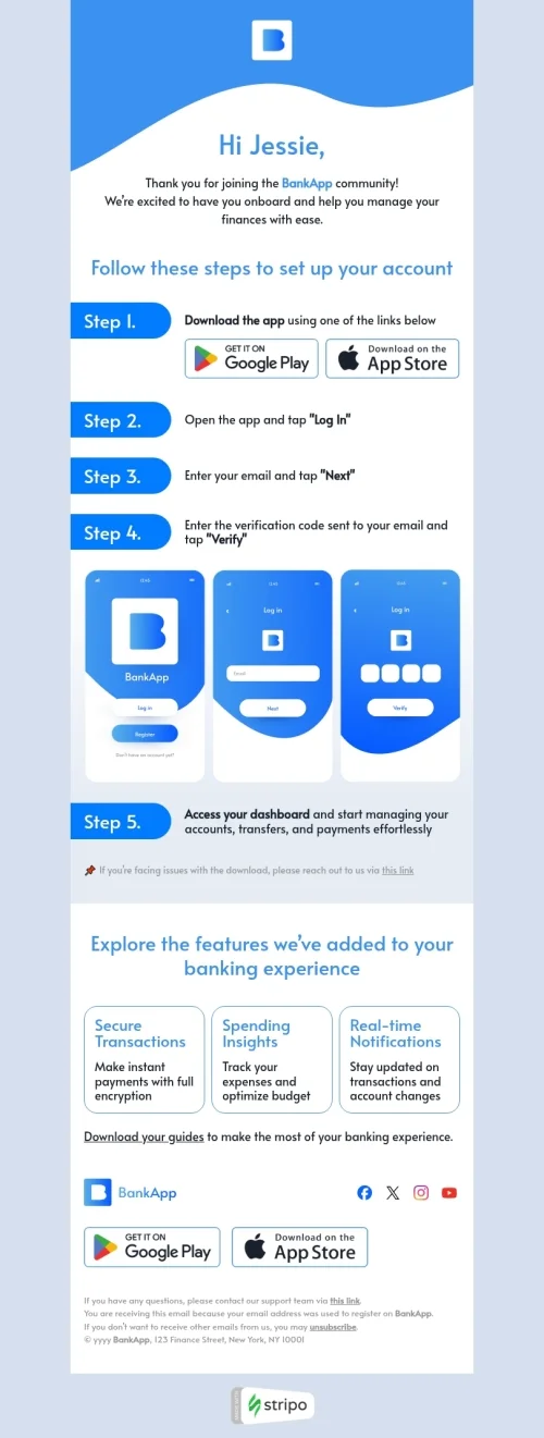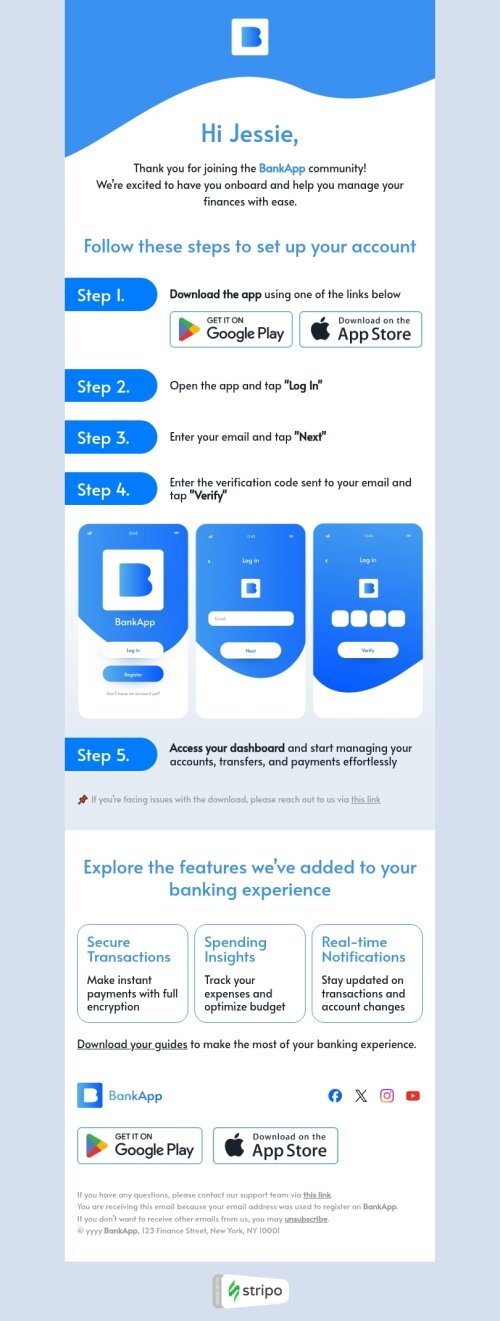 Migliora il tuo percorso finanziario con il nostro modello di email per l'installazione dell'app "La tua esperienza bancaria", progettato per l'industria delle applicazioni mobili. Questo modello invita gli utenti a scaricare e installare la tua app bancaria, mostrando le sue caratteristiche e vantaggi, come la gestione facile degli account, transazioni sicure e aggiornamenti in tempo reale. Con un design intuitivo, evidenzia la comodità e l'efficienza nella gestione delle finanze in movimento. Fai affidamento su questo modello per aumentare le installazioni dell'app, coinvolgere nuovi utenti e favorire un'esperienza bancaria senza soluzione di continuità, consentendo loro di prendere il controllo delle proprie finanze con pochi tocchi.
