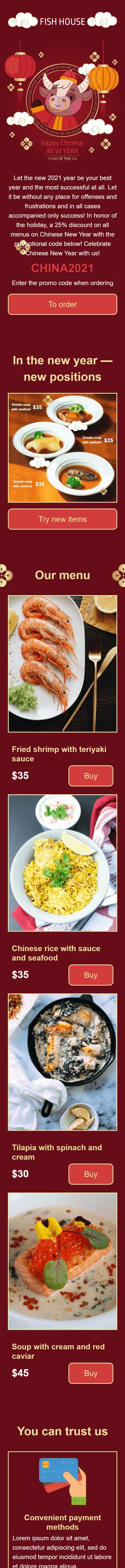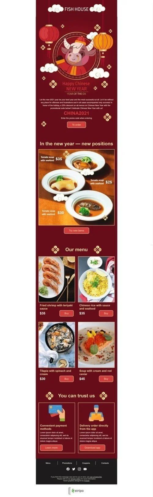 Festeggia il Capodanno Cinese con il nostro modello di email "Fish house" progettato per l'industria alimentare. Questo modello accattivante presenta sezioni personalizzabili per mettere in mostra le tue ultime offerte e promozioni festive. Sottolinea il simbolismo tradizionale del pesce durante questa importante festività e offri ai tuoi clienti uno sconto speciale per mostrare la tua gratitudine. Con il suo design vivace e il formato facile da usare, questo modello ti aiuterà a coinvolgere e connetterti con il tuo pubblico durante la stagione festiva. Fai risaltare le tue promozioni per il Capodanno Cinese con il nostro modello di email "Fish house".