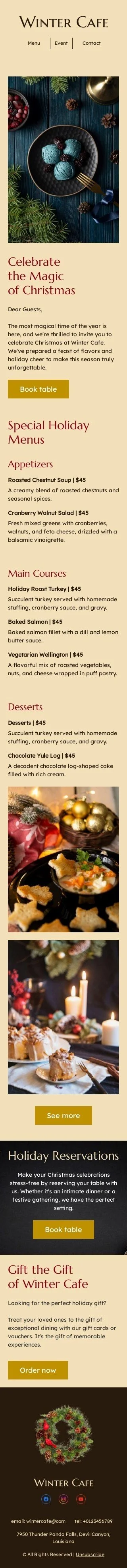 Experience the enchantment with our "Celebrate the Magic of Christmas" email template, designed exclusively for the restaurant industry. This template radiates festive charm, inviting your audience to dine in style during the holiday season. Its visually captivating design sets the mood for a memorable culinary experience. Share holiday menus, special offers, or reservation details with ease. Whether you're creating an unforgettable dining experience or spreading Christmas cheer, this template simplifies communication and sets the standard for inviting Christmas email campaigns in the restaurant industry. Trust its efficiency to engage your audience and celebrate the magic of Christmas with delectable delights.