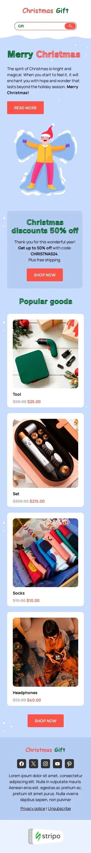 Introducing our "Christmas Fair" email template, tailored for the ecommerce industry. This template exudes festive charm, inviting your audience to your Natale fair with a visually captivating design. Effortlessly share event details and special offers in a format that engages and excites. Whether it's showcasing holiday products or spreading Christmas cheer, this template simplifies communication and sets industry standards for event promotion. Trust its efficiency to keep your ecommerce business in the holiday spirit, ensuring your audience is well-prepared and enthusiastic about attending your Christmas fair.