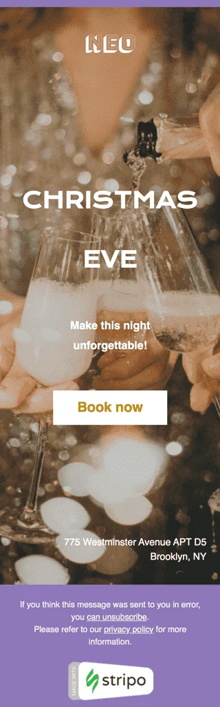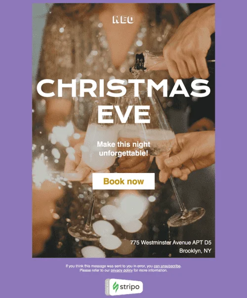 Celebrate the festive season with our "Christmas Meeting" Natale email template designed for the Restaurants industry. This customizable template features sections to showcase your latest holiday menu offerings and promotions for groups and gatherings. Add a personal touch by offering a special Christmas discount or messaggio personalizzato to show your appreciation for your customers. The warm and inviting design of this template is sure to engage and inspire your audience. With its easy-to-use format, you can create a unique holiday message that highlights your restaurant's offerings and dedication to creating unforgettable Christmas dining experiences. Spread the holiday cheer with our "Christmas Meeting" email template.