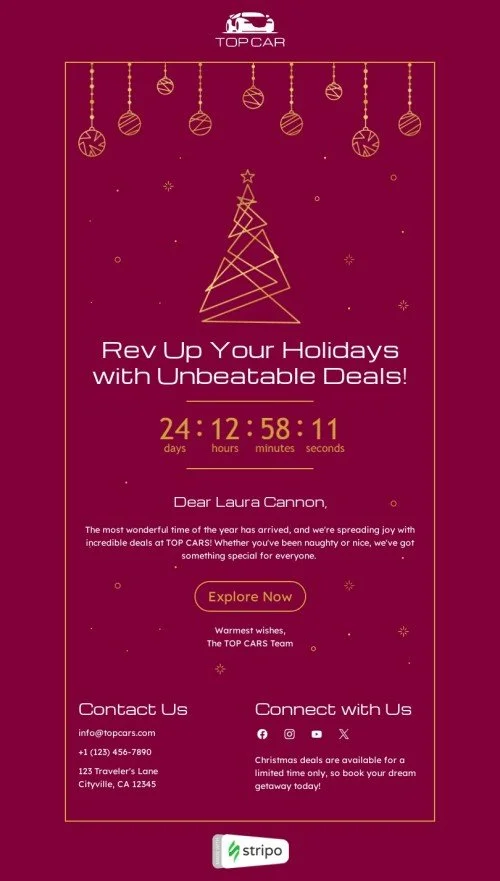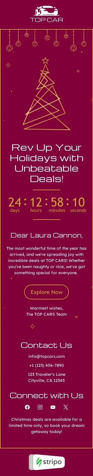 Esplora il nostro "Regalo Perfetto per l'Appassionato di Auto" Natale email template, progettato per l'industria automobilistica e motociclistica. Questo template è una delizia festiva, catturando l'emozione del regalo per gli appassionati di auto con un design visivamente accattivante. Mostra senza sforzo regali automobilistici curati e offerte speciali. Che tu stia promuovendo accessori per auto, attrezzature o offerte natalizie, questo template semplifica la comunicazione e stabilisce lo standard per campagne email natalizie accattivanti nel settore auto e moto. Fai affidamento sulla sua efficienza per coinvolgere il tuo pubblico e guidarli a trovare il regalo ideale per l'appassionato di auto nella loro vita.
