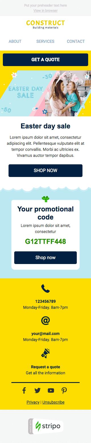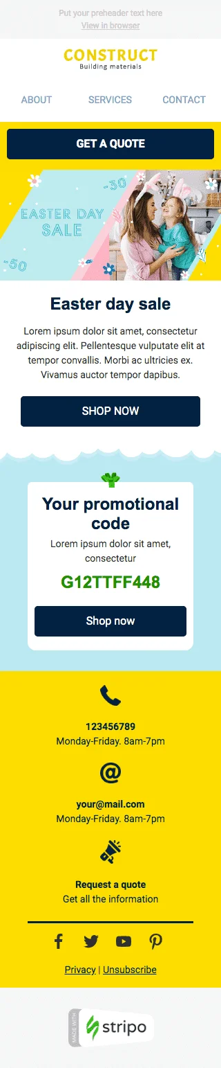 Celebrate Pasqua con il nostro festivo "Pasqua" email template progettato per l'industria delle costruzioni. Questo template personalizzabile presenta sezioni per mostrare i tuoi ultimi progetti e promozioni a tema Pasqua. Aggiungi un tocco personale offrendo uno sconto di Pasqua o un messaggio personalizzato per mostrare la tua gratitudine ai tuoi clienti. Il design colorato e vivace di questo template è sicuro di coinvolgere e ispirare il tuo pubblico. Con il suo formato user-friendly, puoi creare un messaggio unico di Pasqua che mette in evidenza le offerte e la dedizione del tuo marchio allo spirito delle festività.