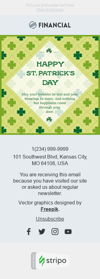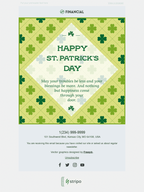 Festeggia St. Patrick's Day con il nostro "Enchanted Time" modello di email progettato per l'industria finanziaria. Questo modello personalizzabile presenta un design ipnotizzante che porta il tuo pubblico in un viaggio magico. Usa il modello per mettere in evidenza i servizi e i prodotti finanziari della tua azienda, incorporando elementi di St. Patrick's Day per aggiungere un tocco di festività. Condividi suggerimenti su come risparmiare di più mentre celebri anche la fortuna degli irlandesi. Il design professionale e coinvolgente di questo modello è sicuro di catturare l'attenzione del tuo pubblico e migliorare l'immagine del tuo marchio. Festeggia St. Patrick's Day con "Enchanted Time".