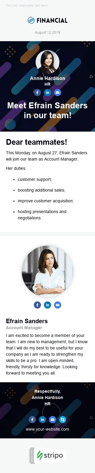 Modello Email Interne «Incontra il nuovo assunto» per il settore industriale di HR