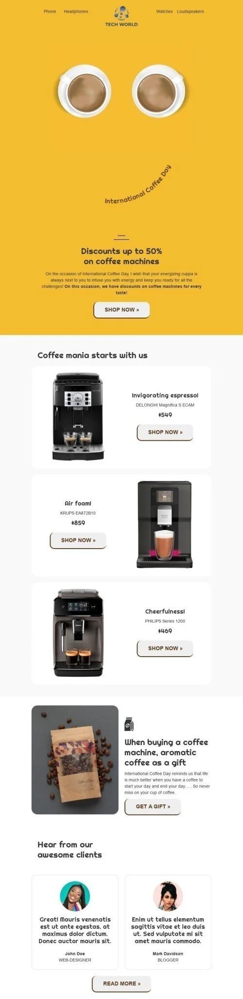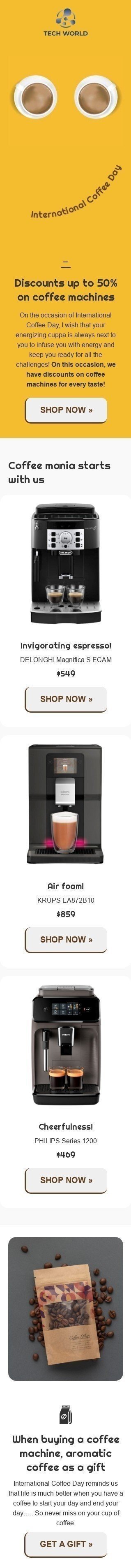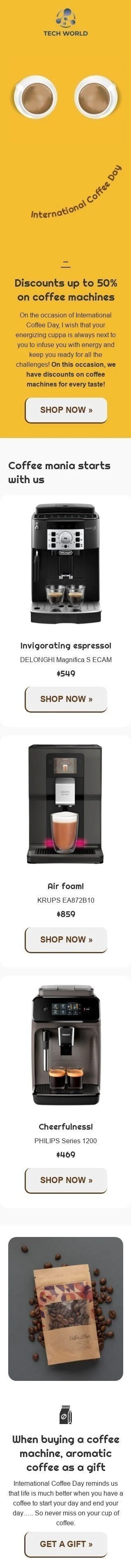 Festeggia la Giornata Internazionale del Caffè con il nostro modello di email "Coffee Smile" per l'industria dei gadget. Questo modello è perfetto per promuovere gadget legati al caffè, come macchine da caffè e tazze da viaggio. Il modello presenta un design caldo e accogliente con immagini di tazze di caffè fumante e un messaggio audace sui piaceri del caffè. L'email include sezioni per mostrare i tuoi prodotti migliori e un pulsante per incoraggiare i destinatari a effettuare un acquisto. È completamente personalizzabile, quindi puoi facilmente aggiungere il tuo marchio e messaggi. Usa il nostro modello di email "Coffee Smile" per connetterti con gli amanti del caffè e aumentare le vendite della tua attività di gadget.