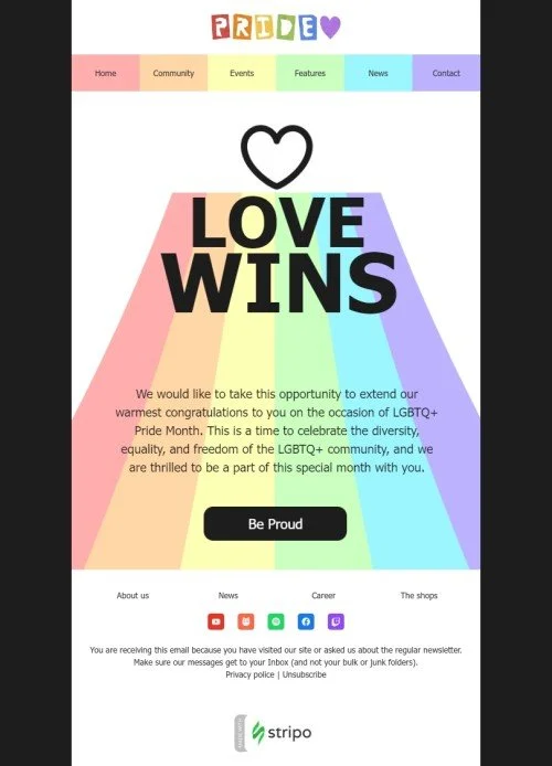 Celebra il Mese del Orgoglio LGBTQ con il nostro modello di email "Love Wins", perfetto per le aziende nel settore degli hobby. Questo modello presenta un design vibrante e inclusivo che riflette lo spirito di amore e accettazione. Con contenuti personalizzabili e grafiche visivamente accattivanti, è lo strumento ideale per diffondere il messaggio di uguaglianza e mostrare supporto per la comunità LGBTQ. Non perdere questa opportunità di coinvolgere il tuo pubblico e promuovere l'inclusività con il nostro modello di email professionale e impattante. Uniamoci per celebrare l'amore e la diversità durante il Mese del Orgoglio.