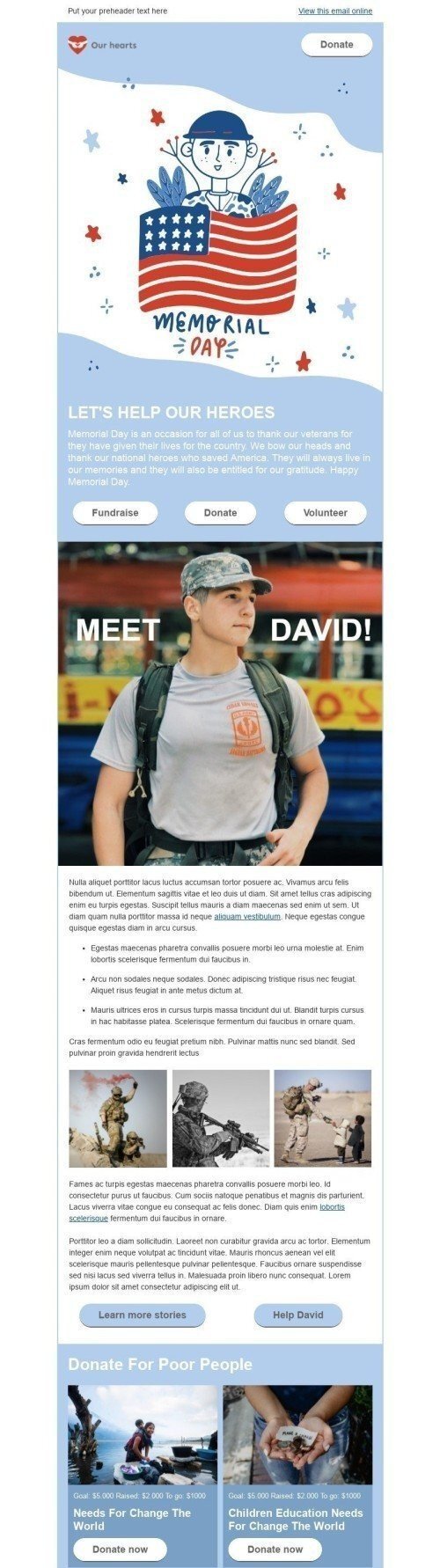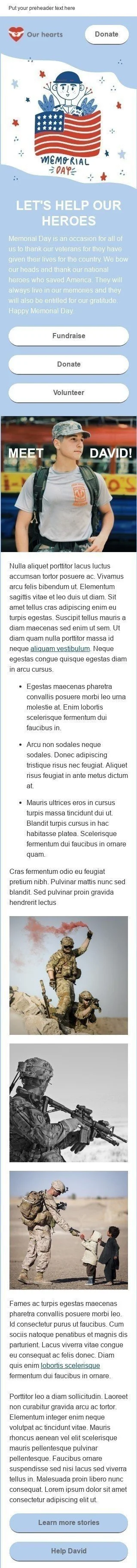 Modello Email Memorial Day «Aiutiamo i nostri eroi» per il settore industriale di No profit e beneficenza