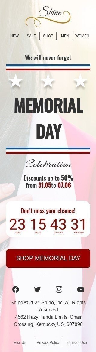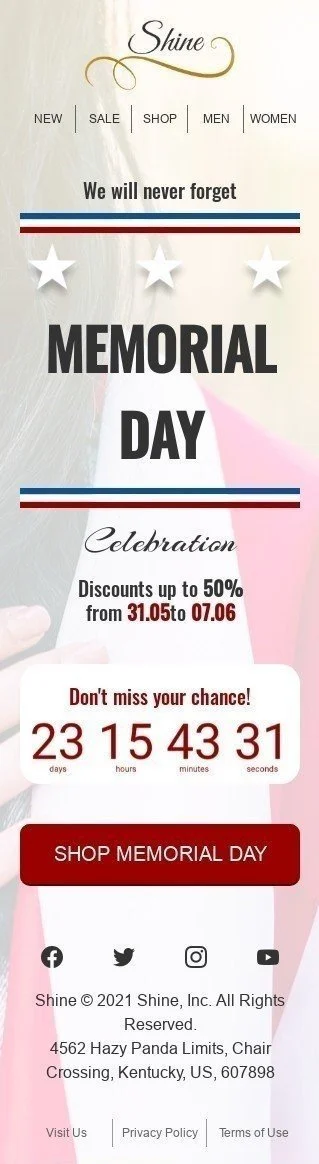 Onora i caduti con il nostro "Non dimenticheremo mai" modello di email per il Memorial Day per l'industria della moda. Questo modello mostra la tua ultima collezione di moda con un tocco di patriottismo e apprezzamento per coloro che hanno servito. Con un chiaro call-to-action e un focus sul ricordare i caduti, questo modello è perfetto per promuovere il tuo marchio e raggiungere i clienti durante questa festività significativa. Che tu stia promuovendo vendite, offerte speciali o nuove arrivi, questo modello ti aiuterà a connetterti con i clienti e incoraggiarli ad aggiornare il loro guardaroba in memoria di coloro che hanno servito.