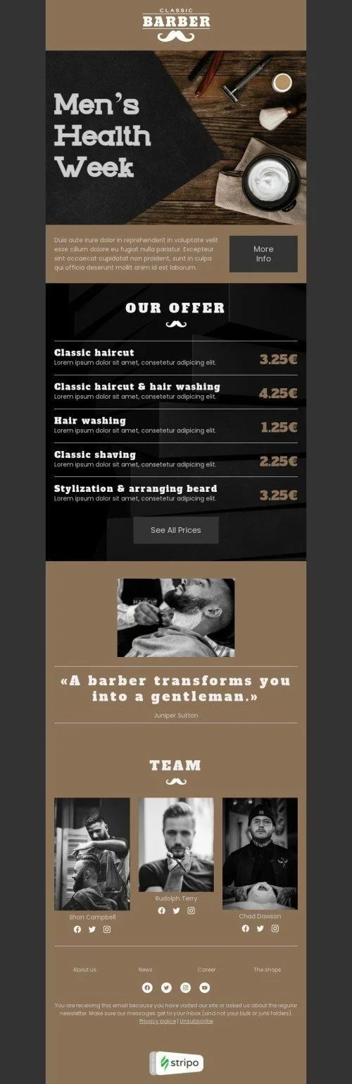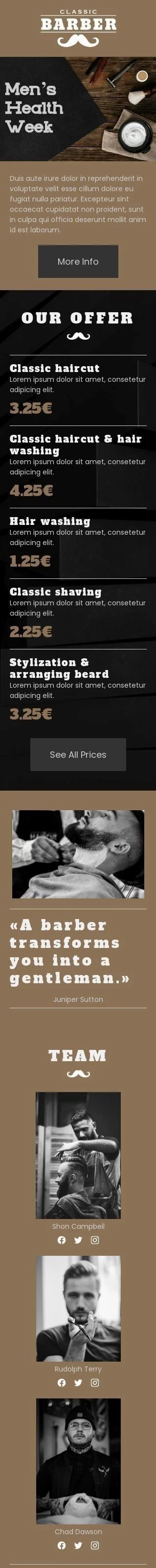Introducing our "Classic Haircut" email template for the beauty and personal care industry in celebration of Men's Health Week. This customizable template features a sophisticated design that promotes self-care and encourages subscribers to prioritize their well-being. Use this template to showcase your latest men's grooming products and offer tips for maintaining healthy hair. With a strong call-to-action button and visually appealing design, this email template is sure to drive engagement and increase your sales. Don't miss the chance to celebrate Men's Health Week and promote a healthy lifestyle through our engaging email template.