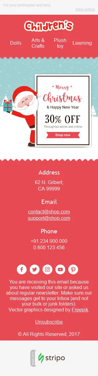 Immergiti nello spirito natalizio con il nostro modello di email natalizia "Gentile Babbo Natale", perfetto per il settore dei prodotti per bambini. Delizia i tuoi clienti con un design festoso che presenta i tuoi ultimi prodotti e le tue offerte. Con chiari inviti all'azione e un focus sulle allegre illustrazioni di Babbo Natale, questo modello diffonderà sicuramente allegria e porterà allegria natalizia ai tuoi clienti. Che tu stia promuovendo nuovi arrivi, offerte speciali o saldi natalizi, questo modello ti aiuterà a raggiungere i clienti e a incoraggiarli ad acquistare per i loro bambini in questa stagione. Preparati a diffondere un po' di magia natalizia con questo grazioso modello di email.