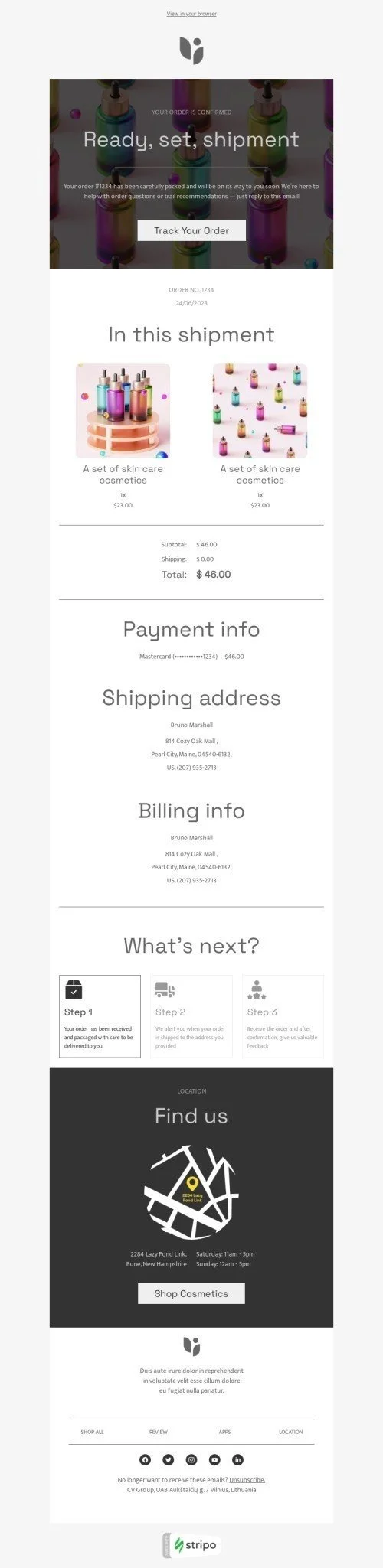Modello email сonferma dell’ordine «Pronto, partenza, spedito» per il settore industriale di bellezza e cura della persona