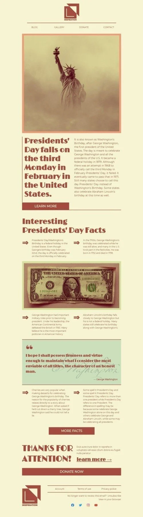 Modello Email Giorno dei presidenti «Il compleanno di Washington» per il settore industriale di Editoria e blog