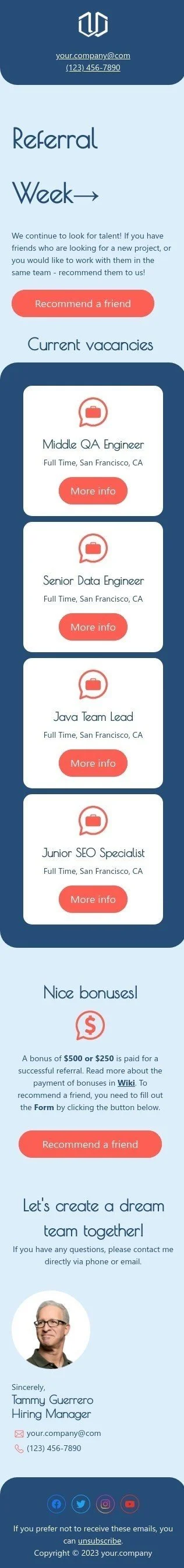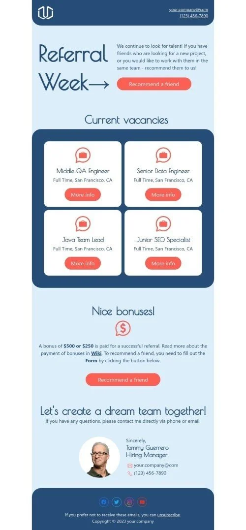 Introducing our latest Promo Email Template "Current Vacancies" designed specifically for the Business industry. This template is perfect for promoting your job openings and attracting potential candidates to join your team. With its professional and organized design, "Current Vacancies" will showcase your company's culture and values. You can customize the template with your own images and text to reflect your brand's personality and message. Use "Current Vacancies" to promote your job postings, career events, and opportunities, and find the right talent to drive your business forward.