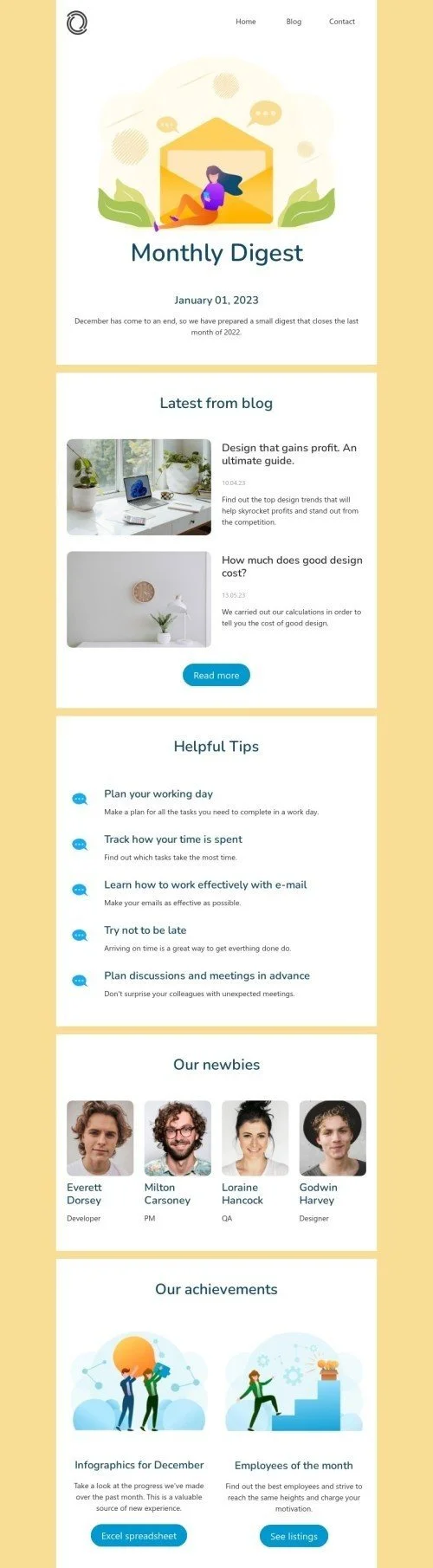 Il modello di email promozionale "Helpful Tips" è lo strumento perfetto per il tuo settore aziendale. Con un design pulito e professionale, questo modello fornisce informazioni e suggerimenti preziosi ai tuoi clienti mentre promuove il tuo marchio e i tuoi prodotti. Mostra la tua esperienza e metti in evidenza le tue offerte con chiari inviti all'azione, incoraggiando i clienti a sfruttare le tue promozioni e sconti. Usa questo modello per costruire relazioni e aumentare le vendite, rendendo la tua azienda la fonte principale per suggerimenti utili e prodotti essenziali. Celebra il successo e la crescita con il modello di email "Helpful Tips".