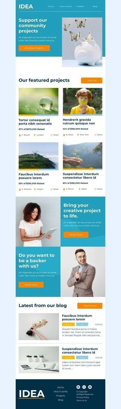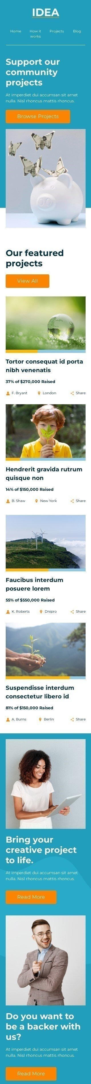 Fai la differenza con il nostro Template "Supporta la nostra comunità" progettato specificamente per l'industria del Crowdfunding. Questo template è perfetto per promuovere una campagna di raccolta fondi o un'iniziativa sociale per supportare una comunità bisognosa. L'email include un titolo accattivante, un chiaro invito all'azione, e un pulsante che rimanda alla pagina delle donazioni. Include anche una sezione che evidenzia l'impatto della campagna e la comunità che sarà aiutata. Questo template è completamente personalizzabile e può essere utilizzato per aumentare la consapevolezza e il coinvolgimento per la tua campagna.