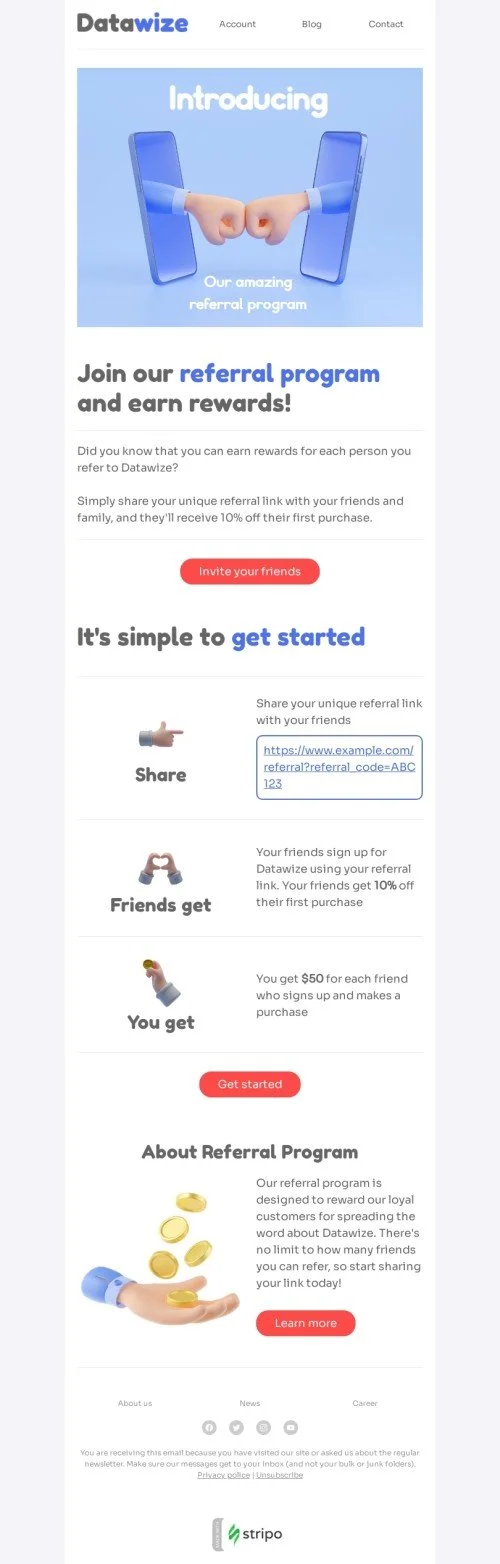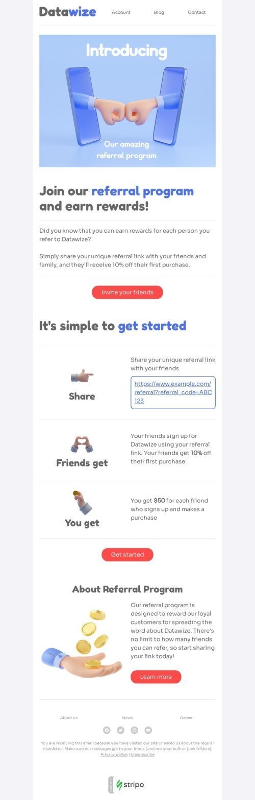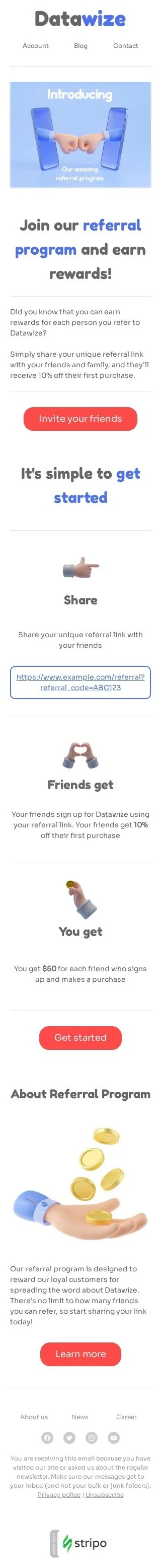 Il nostro modello di email "Programma di Referral Straordinario" è lo strumento perfetto per aziende SaaS che cercano di incentivare i loro clienti a riferire altri. Con un design visivamente accattivante, contenuti personalizzabili e messaggi chiari, questo modello comunica efficacemente i benefici del programma di referral. Incoraggia gli utenti a invitare i loro amici e colleghi a unirsi alla piattaforma, evidenziando le ricompense che possono guadagnare. Non perdere questa opportunità di sfruttare il potere dei referral e far crescere la tua base utenti con il nostro modello di email SaaS professionale e impattante. Inizia a massimizzare la tua portata e le tue ricompense oggi!