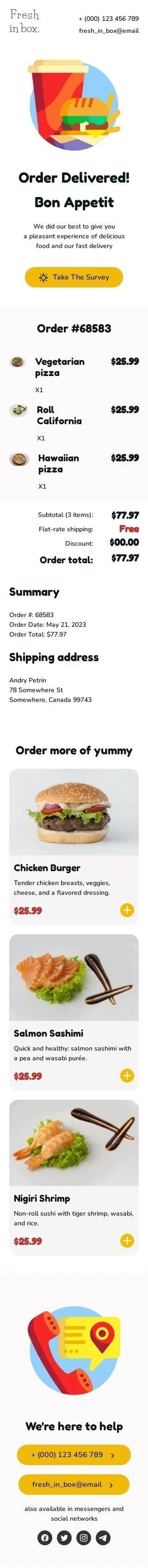Informi i tuoi clienti che il loro cibo è stato consegnato con il nostro Template "Ordine Consegnato". Perfetto per l'industria alimentare, questa email automatizzata notificherà i tuoi clienti che il loro ordine è stato consegnato e fornirà loro tutte le informazioni necessarie come il numero di tracciamento e i dettagli della consegna. Questo template è facile da personalizzare e ti aiuterà ad aumentare la soddisfazione e la fedeltà dei clienti.