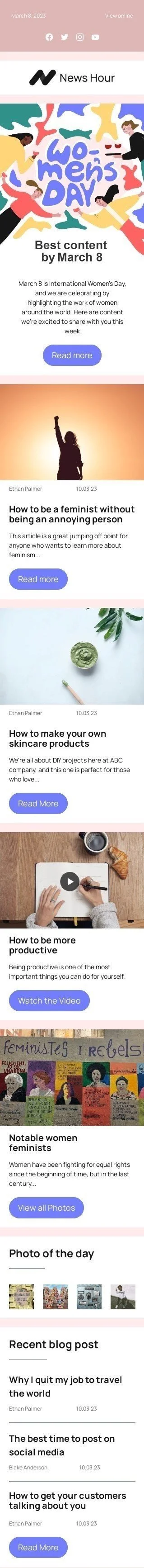 Il "Miglior contenuto entro l'8 marzo" template di email per la Giornata della Donna è perfetto per il settore delle pubblicazioni e del blogging. Mostra il miglior contenuto creato da e per le donne, con un design moderno che mette in risalto il tuo marchio. Con un chiaro focus sull'ispirare e potenziare le donne, questo template ti aiuterà a raggiungere il tuo pubblico e incoraggiarli a interagire con il tuo contenuto. Usa questo template per promuovere articoli, video, podcast e altro, e mostra il tuo supporto per le questioni femminili in questo giorno speciale. Preparati a celebrare la Giornata della Donna con stile con questo bellissimo template di email.