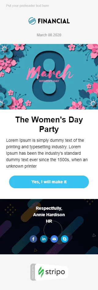 Celebrate Women's Day with our "Corporate Party" email template designed for the Human Resources industry. This customizable template features sections to showcase your appreciation for the hard-working women in your organization. Add a personal touch by sharing photos and stories of women employees who have made significant contributions to the company. The elegant and professional design of this template is sure to engage and inspire your audience. With its user-friendly format, you can create a unique Women's Day message that highlights your company's commitment to gender equality and inclusivity.