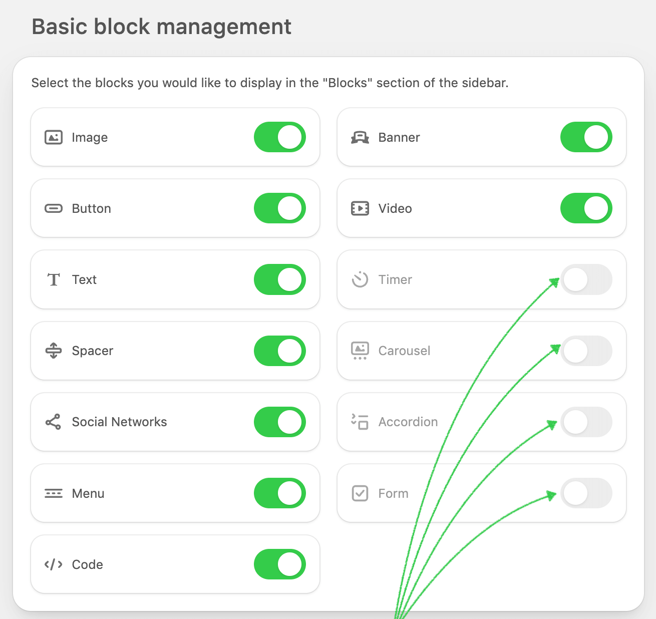 | ignoreClickOutsideSelectors | No | List of selectors of elements, click on which does not start the clickOutsidePreview event and as a result does not reset the block selection in the preview area. | |