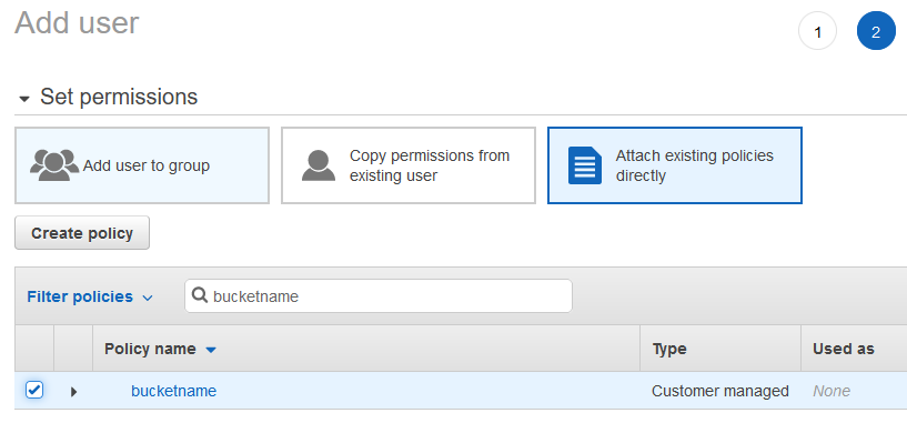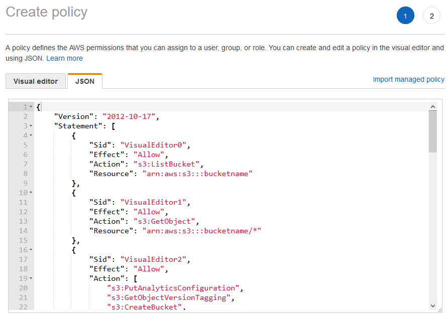 { "Version": "2012-10-17", "Statement": [ { "Sid": "VisualEditor0", "Effect": "Allow", "Action": [ "s3:GetObject", "s3:PutObject", "s3:GetBucketCORS", "s3:DeleteObject", "s3:ListBucket" ], "Resource": [ "arn:aws:s3:::bucketname", "arn:aws:s3:::bucketname/*" ] } ] }Please be advised that you should replace the