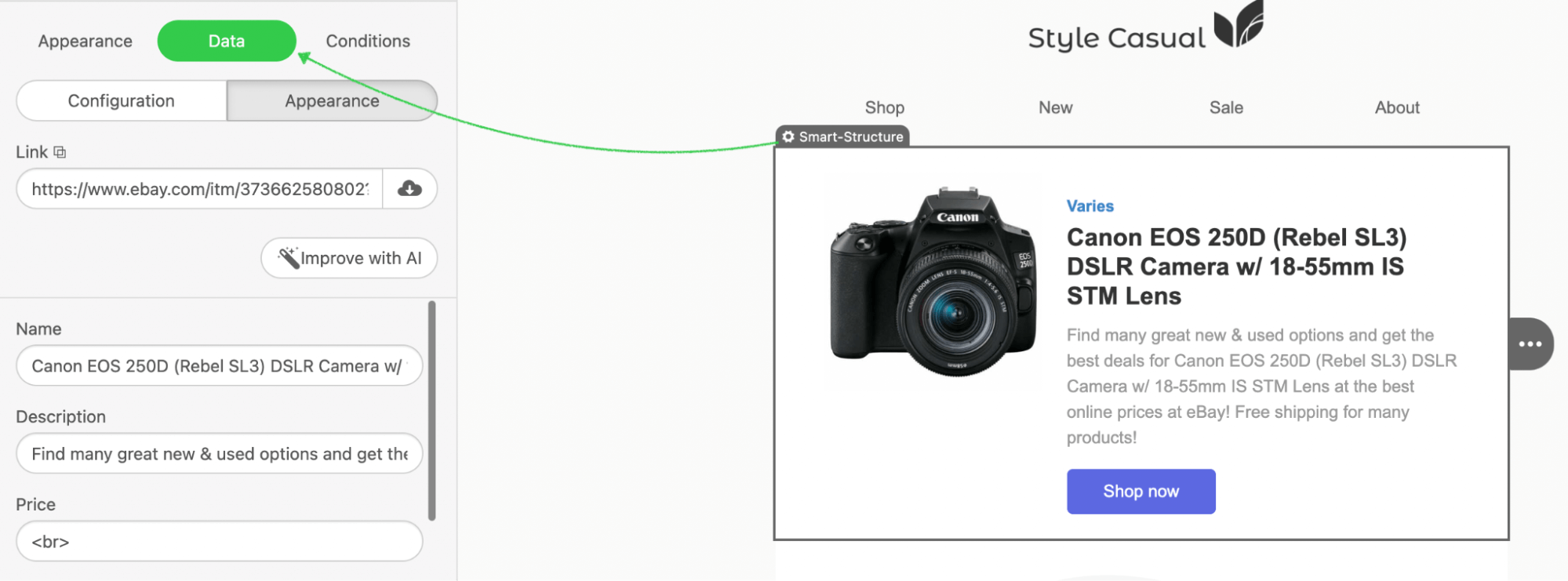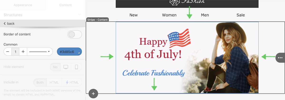 This feature allows you to track which element (block, container, structure, or stripe) is selected by the customer within the Stripo Plugin. Additionally, it provides the capability to retrieve and update the HTML of the selected element if needed.