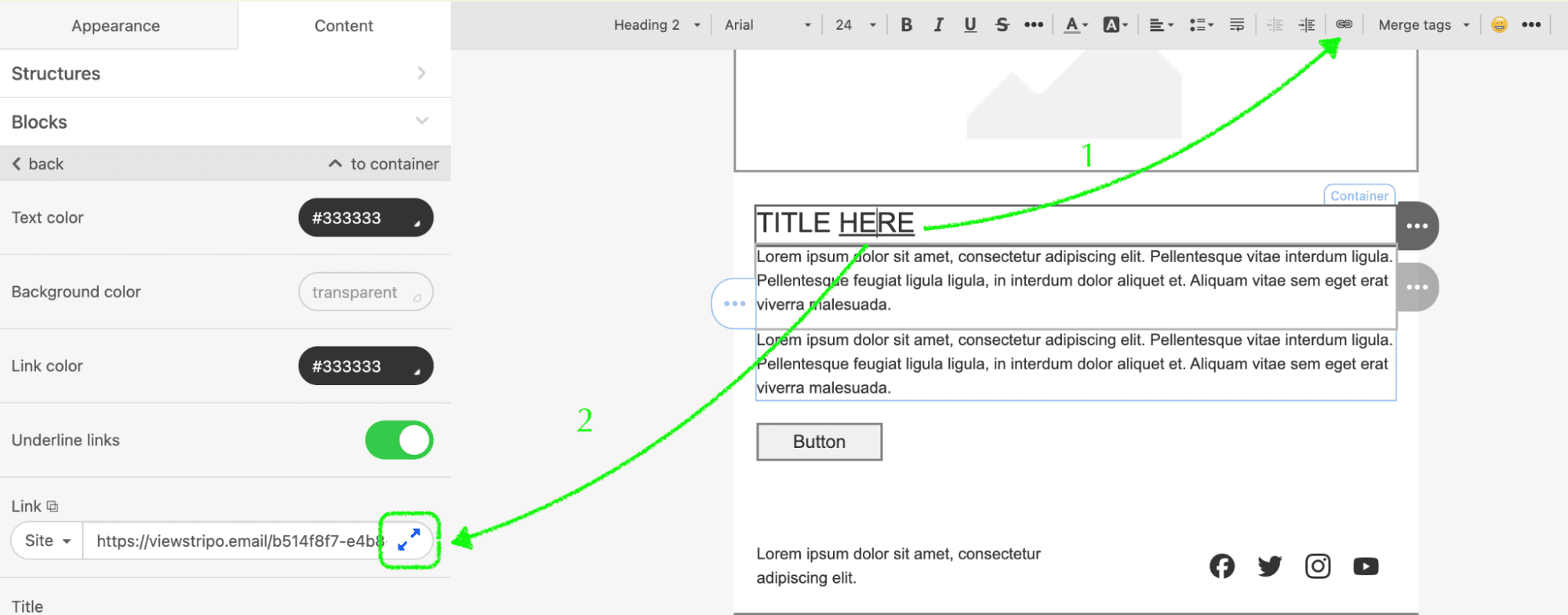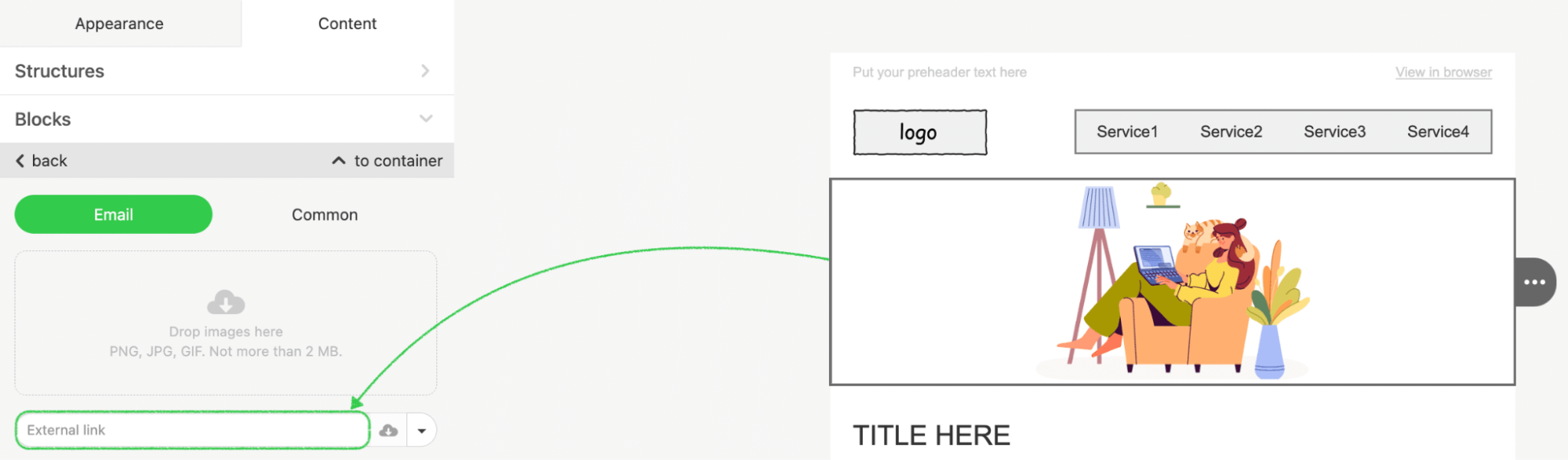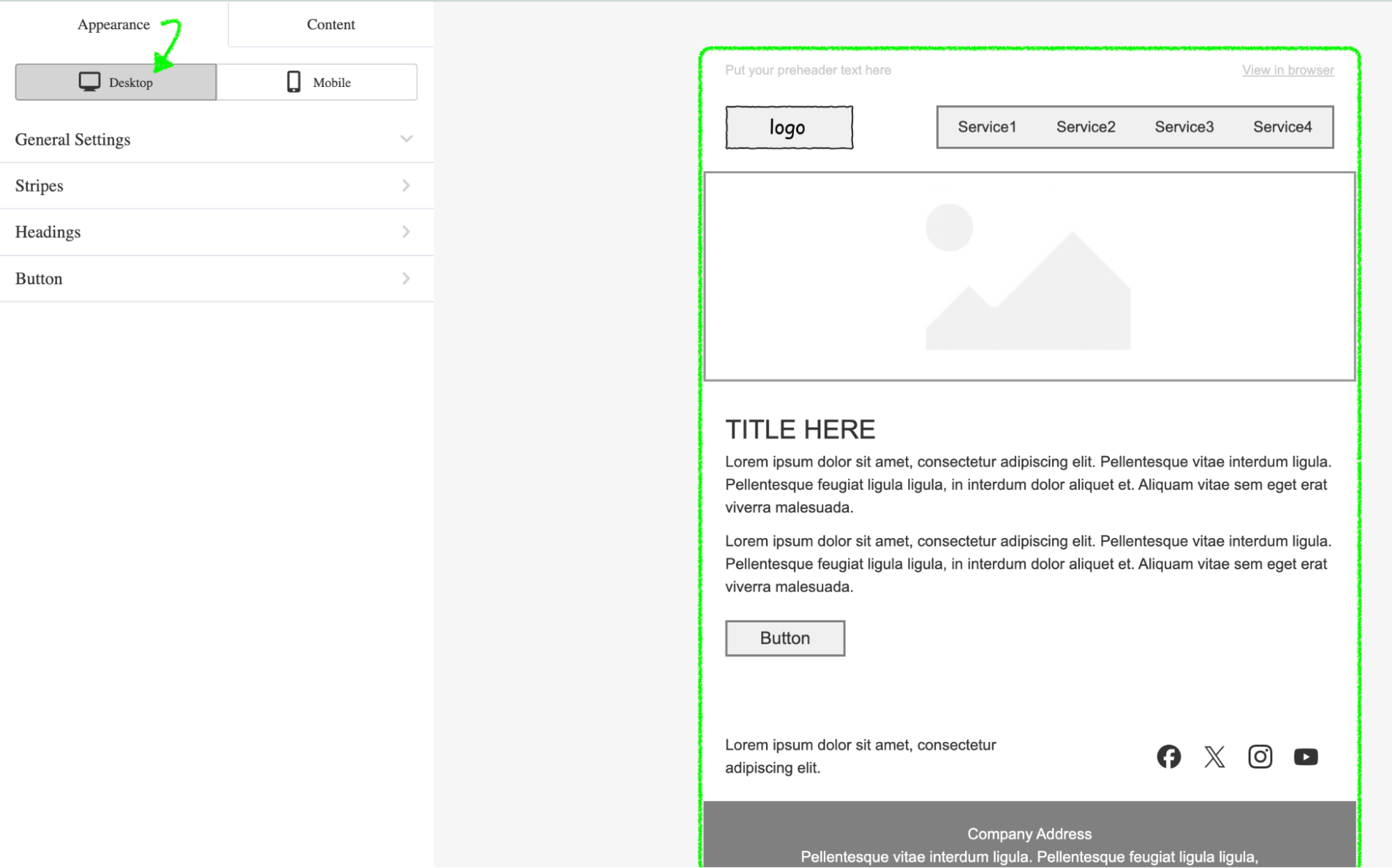 Define 2 containers for the Stripo settings panel (where controls will be located) and the Stripo preview area (the area where the rendered email template will be displayed).