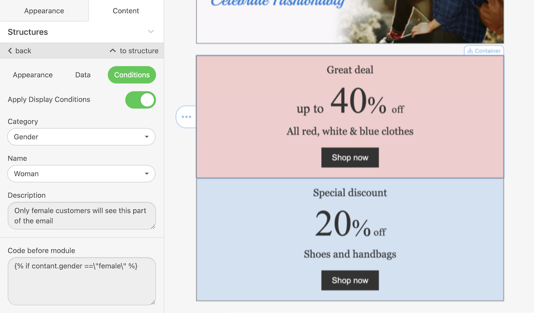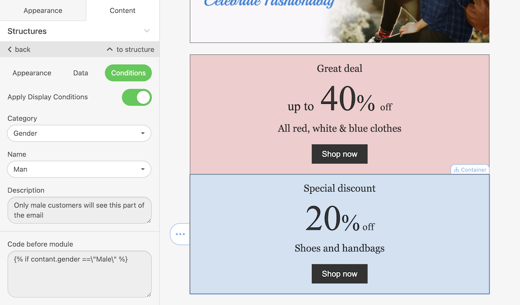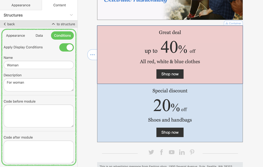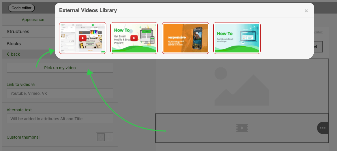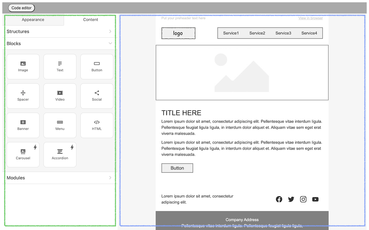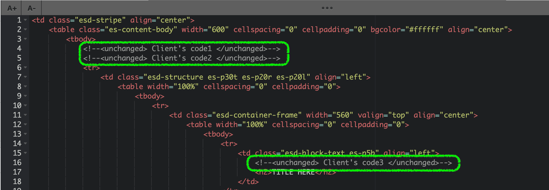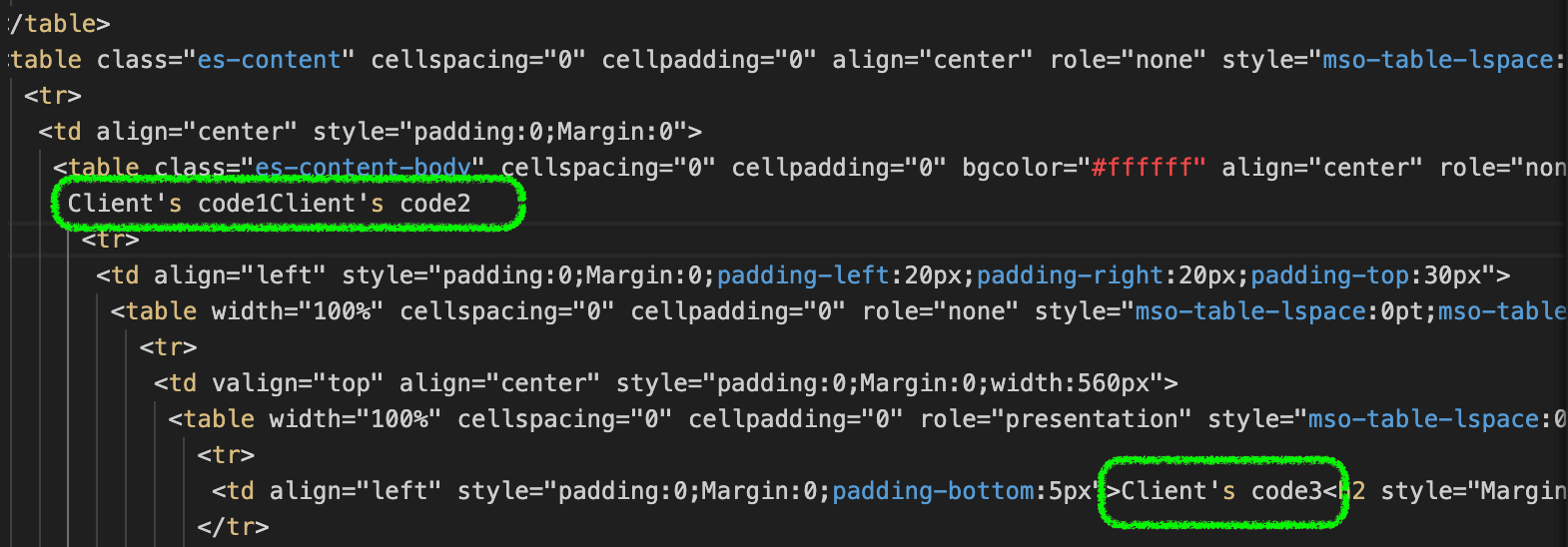 Customers often modify emails using editor options for each element (such as stripes, structures, etc.). However, in some cases, it's necessary to remake the content using the provided HTML. This feature facilitates such modifications by identifying the selected element and enabling HTML retrieval and updates.