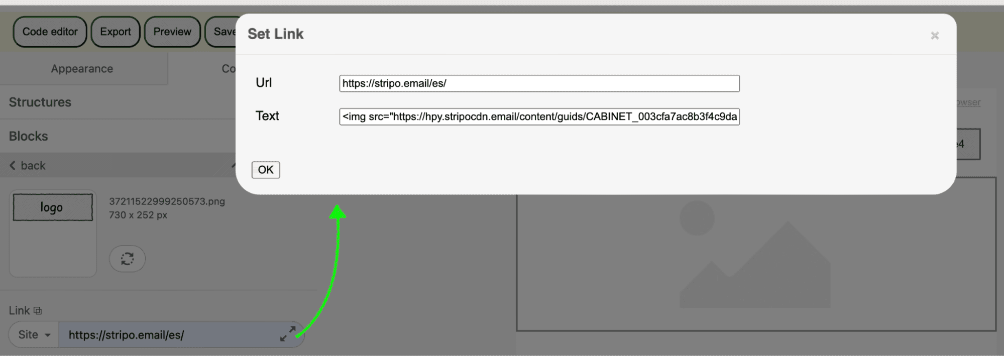 stripoPreviewContainer, by default, stretches from the place where it was inserted to the bottom of the screen. To set another value, you need to set the max-height inline style for this container; - the height of