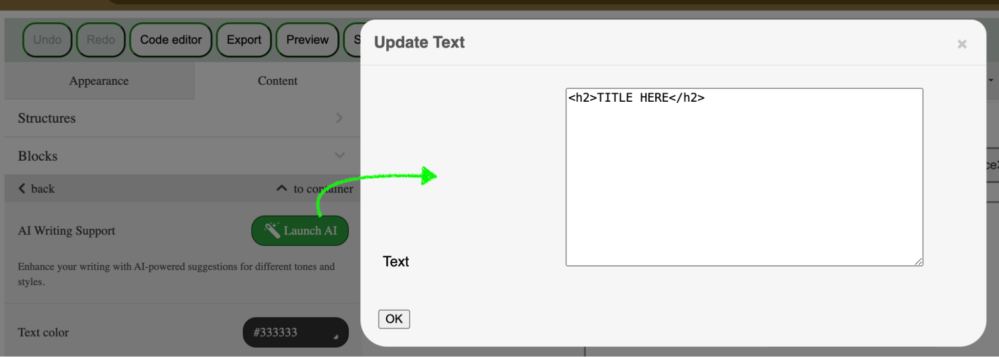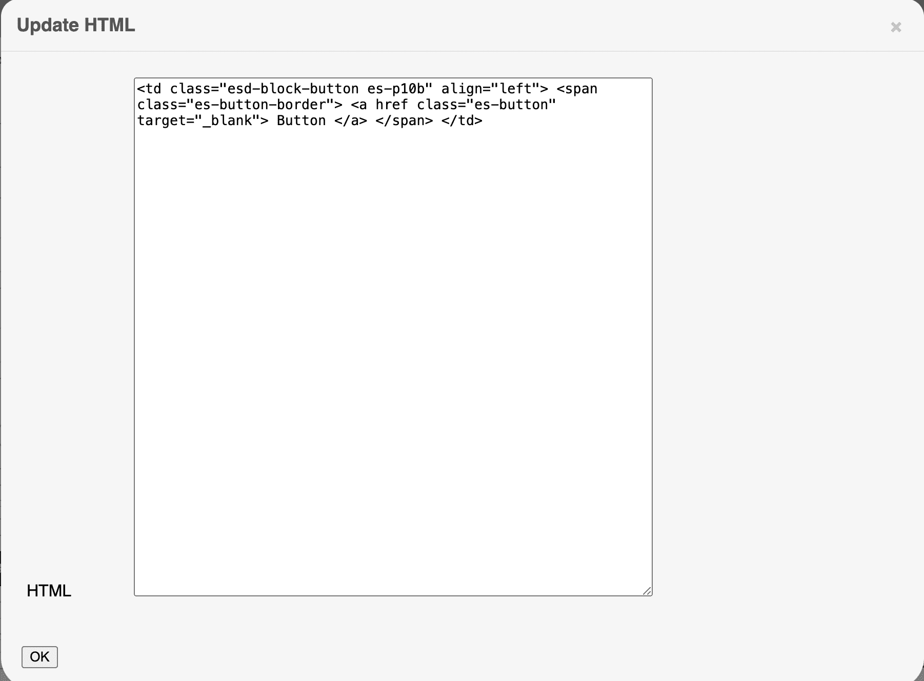 To see this feature in action, click on a button block in the provided example. This will display a pop-up window where you can view or edit the HTML.