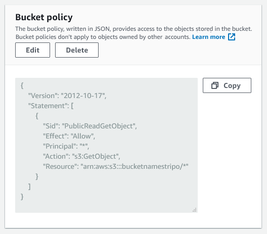 { "Version": "2012-10-17", "Statement": [ { "Sid": "PublicReadGetObject", "Effect": "Allow", "Principal": "*", "Action": "s3:GetObject", "Resource": "arn:aws:s3:::bucketname/*" } ] }Please be advised that you should replace the