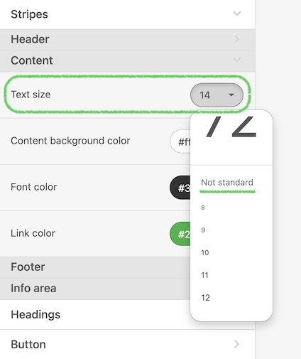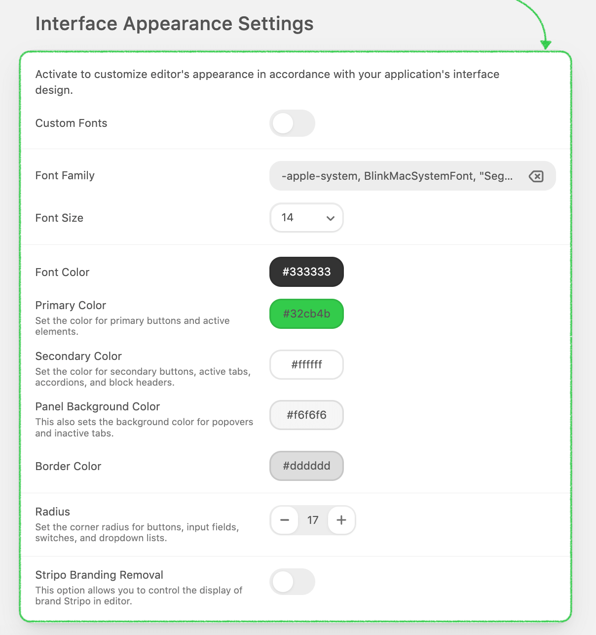 stripoSettingsContaineris, by default, stretched to the height of the content and limited to the bottom of the screen. To set another value, you need to set the max-height inline style for this container;