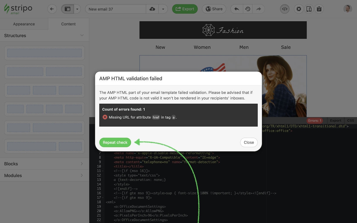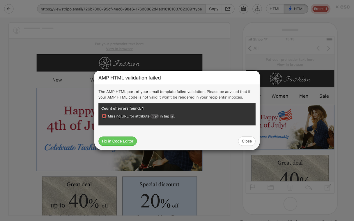 Some errors may appear when users work on their emails. In order to notify your users about such errors and help them fix the bugs, the showAmpErrorsModal function is at your service.