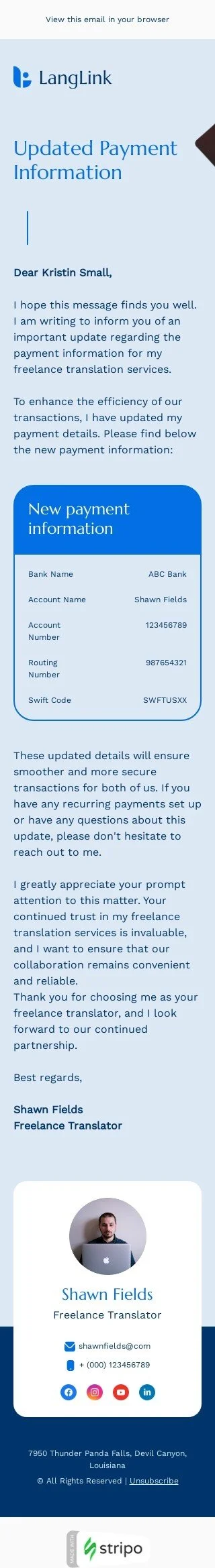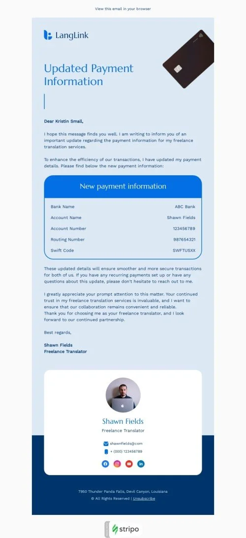 Apresentando nosso "Informações de Pagamento" confirmação de e-mail template, uma solução especializada para a indústria de tradução. Este template torna os processos de pagamento diretos e profissionais. Com um formato amigável, comunica facilmente detalhes vitais de pagamento aos clientes. Personalize-o facilmente para incluir detalhes da fatura e orientações de pagamento. Eleve a satisfação do cliente ao oferecer uma experiência de pagamento sem interrupções. Conte com este template para simplificar suas transações financeiras, construindo confiança e dependabilidade dentro de seus serviços de tradução. É uma ferramenta vital para comunicação transparente e interações financeiras sem esforço com seus valiosos clientes, garantindo uma experiência de pagamento sem complicações.