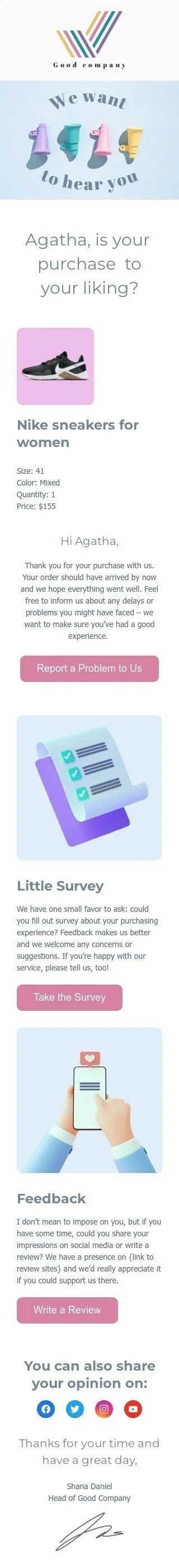 Modelo de e-mail de «Queremos ouvir você» de serviço ao cliente para a indústria de moda