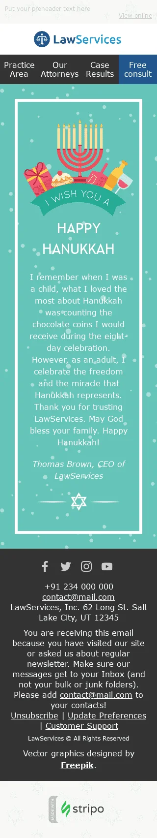 Nosso modelo de email para o Hanukkah "Festival das Luzes" é perfeito para a indústria jurídica. Com seu design elegante e festivo, permite que você envie aos seus clientes votos calorosos para a temporada de festas enquanto promove seus serviços ao mesmo tempo. Se você é um escritório de advocacia, advogado ou consultor jurídico, este modelo ajudará você a se conectar com seus clientes e construir relacionamentos mais fortes. Com elementos personalizáveis e uma forte chamada à ação, você pode aproveitar ao máximo a temporada de festas e criar uma campanha memorável para seus clientes. Celebre a temporada de luz e compartilhe a alegria com seus clientes.