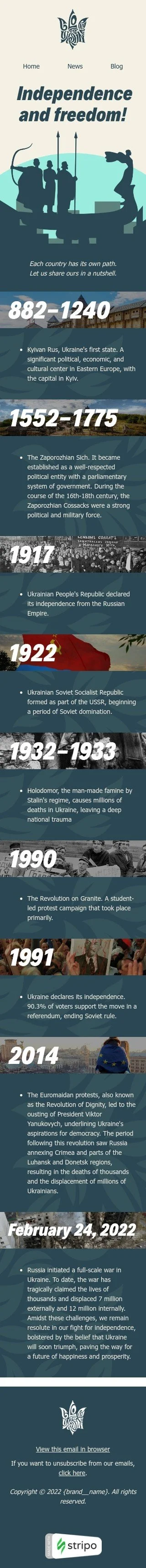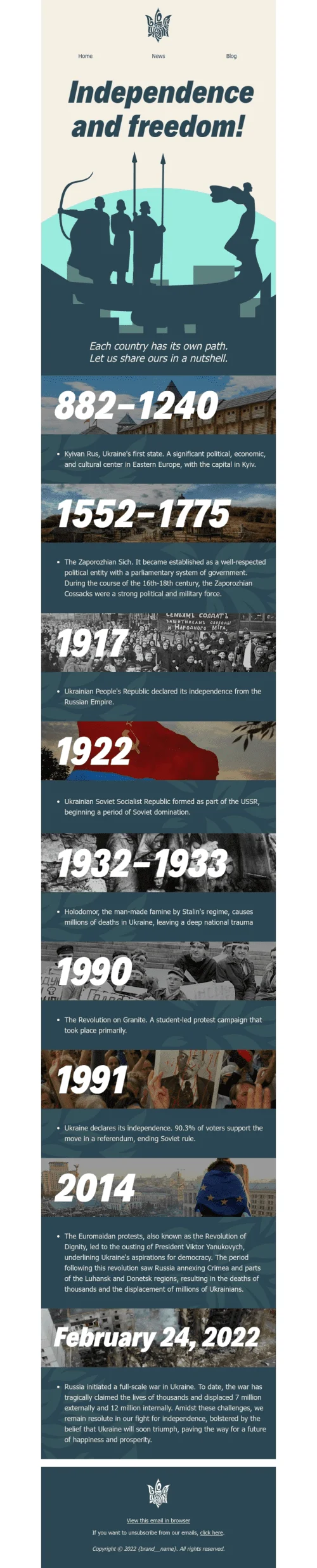 Marque o espírito de liberdade com nosso "Independência e Liberdade!" modelo de email, criado para organizações sem fins lucrativos. Este modelo captura o fervor do Dia da Independência da Ucrânia, apresentando visuais dinâmicos e conteúdo traduzido que presta homenagem à jornada da nação em direção à liberdade. Personalize-o de acordo com a ética da sua organização e motive os destinatários a participar da celebração. Aproveite esta oportunidade para amplificar a missão da sua organização sem fins lucrativos e ficar em solidariedade com o caminho da Ucrânia. O "Independência e Liberdade!" modelo de email capacita você a honrar a essência da libertação e aumentar a conscientização de forma convincente.